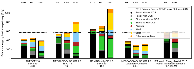 Figure 2.15 of the IPCC SR15, showing the primary energy development in illustrative pathways